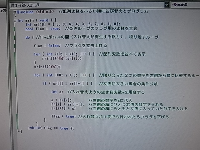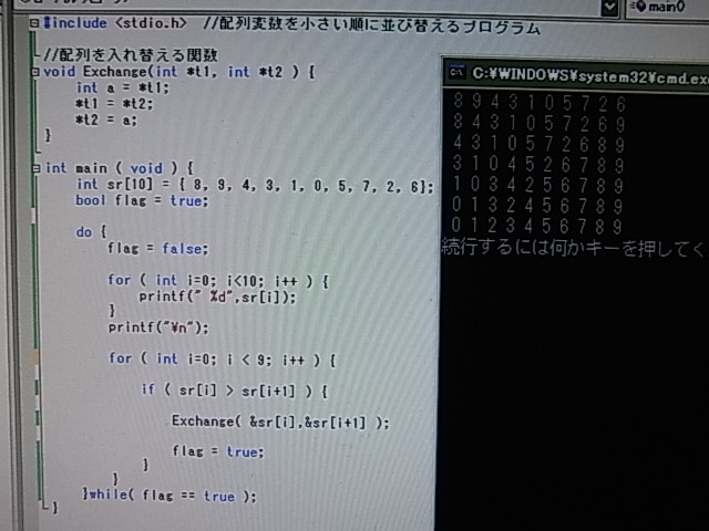 入れ替え前の最初の状態を表示するためだけに、入れ替えループの前にも配列を表示する部分があったので、ループ内の順序を変えて、表示部分を1回で済むようにした。