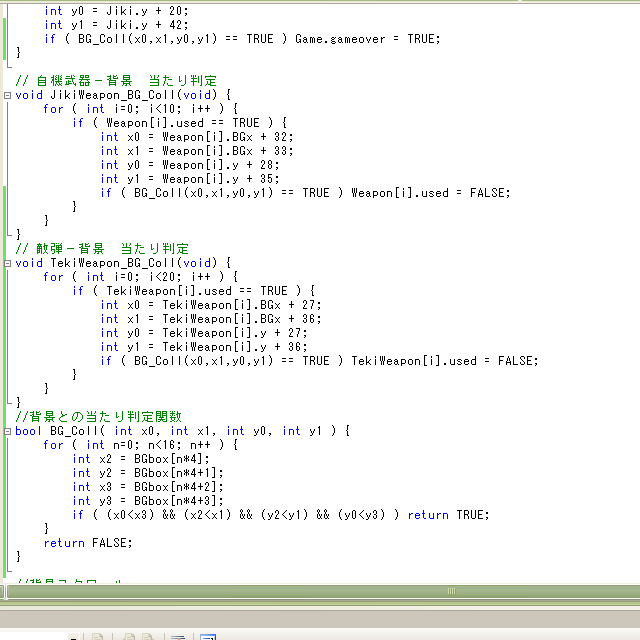 で、今までは各キャラクターと背景の当たり判定を行う関数ごとに、当たり判定の処理を入れていたんだけど、その処理部分を当たっていればTRUEを返す専用の関数にして、判定したい対象オブジェクトのX0、Y0、X1、Y1の座標を渡せば結果が得られるようにしました。