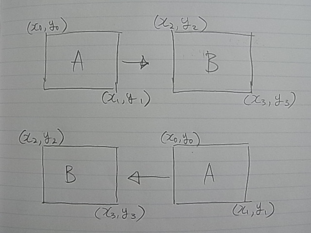 Bの左上・右下の座標を(X2,Y2)、(X3,Y3) とした時に