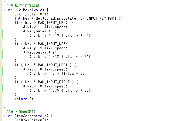 操作に対して、座標を加減した後、その座標(自機)が画面外に出ていないか判断し補正する if 文を付け加えています。