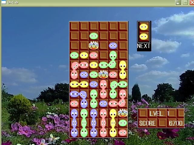 あとは、4つ以上つながったぷよが消える処理をする関数に、フィールド上に7番があった場合はその上下左右を調べて消えるグループがあったら一緒に消すってコードを加えた。