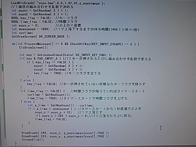 んで、その後ループ内で現在の時間からcurtimeを引いた値が1秒になったら、ぷよを1マス落とす。